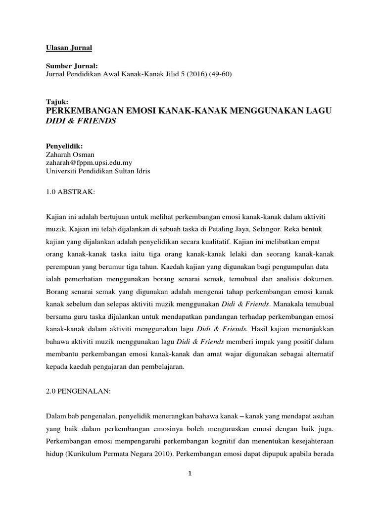 4 5903115622715228434 Pdf Jurnal Pendidikan Awal Kanak Kanak Jilid 5 2016 49 Perkembangan Emosi Kanak Kanak Menggunakan Lagu Didi Friends Emotional Course Hero